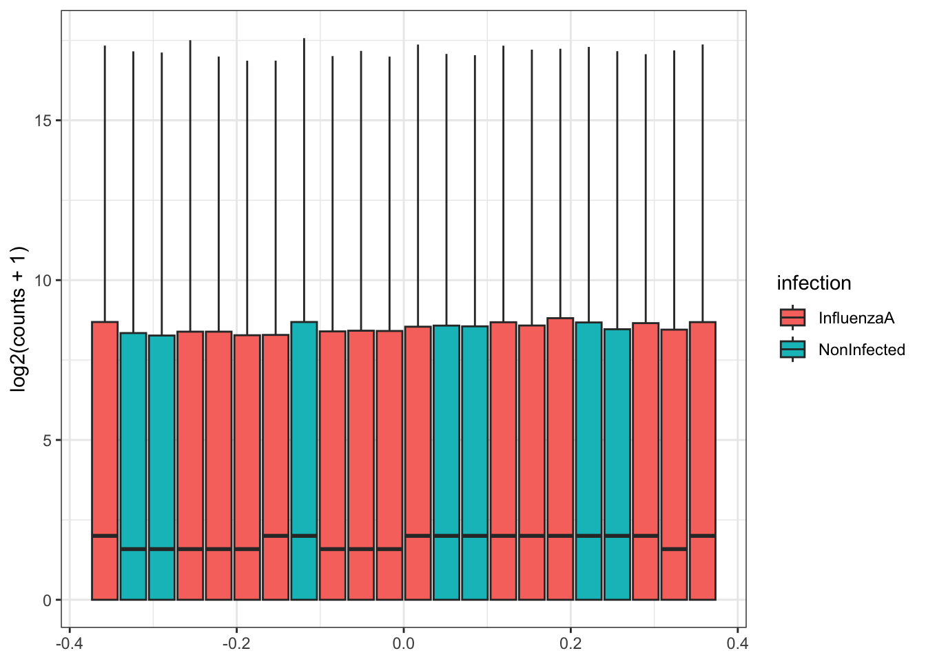 ggplot(aes(y=log2(counts + 1), group=.sample, fill=infection)) +
