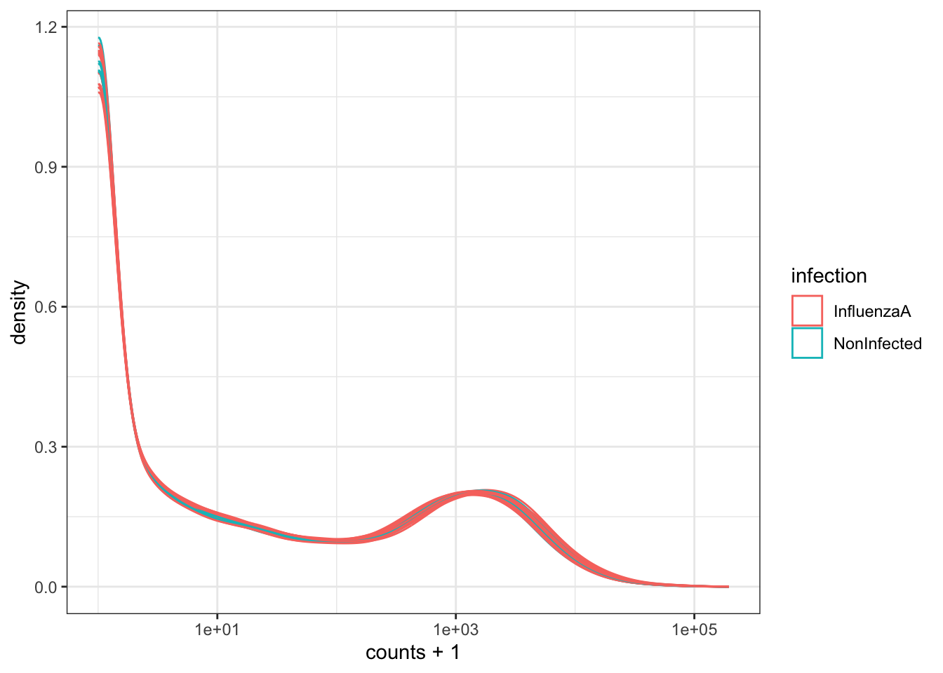 ggplot(aes(counts + 1, group=.sample, color=infection)) +