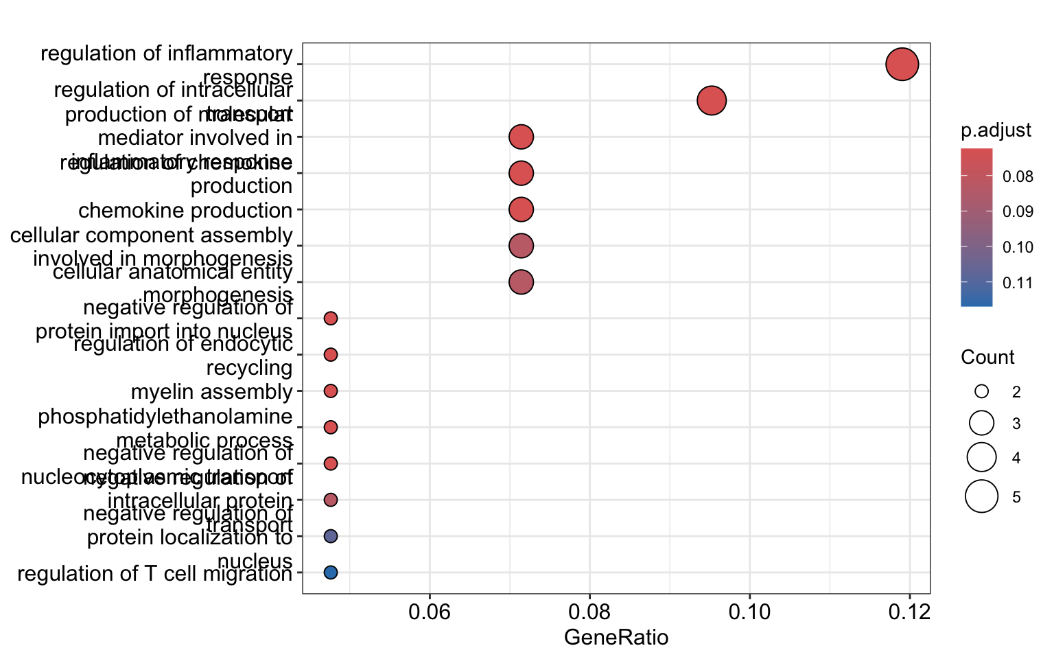 In our case, we see that our gene set has genes associated with structural constituent of myelin sheath, regulation of inflammatory response, among other annotations.