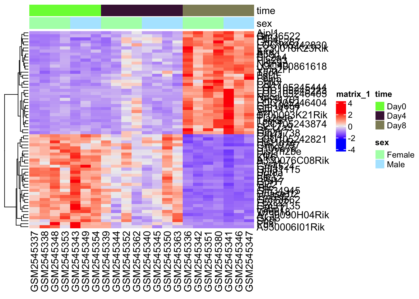 We can look at our gene set as a heatmap to understand the expression patterns in our data.